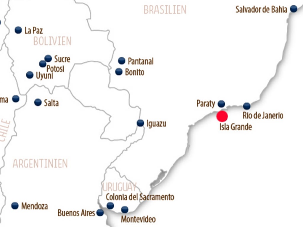 Wenn Sie heute zum Festland zurückkehren, sollten Sie frühzeitig die Koffer packen, da die Boote zum Cais de Santa Luzia in Angra dos Reis schon am Morgen ablegen. Lassen Sie auf den neunzig Minuten Bootsfahrt Ihren Aufenthalt auf der Ilha Grande Revue passieren und freuen Sie sich auf die nächsten Abenteuer, die Sie in Brasilien erwarten werden! Entdecken Sie zum Beispiel unsere Reisepakete in Paraty oder Rio de Janeiro. Oder möchten Sie lieber weitere Highlights brasilianischer Natur bestaunen? Ob das Umland von Bonito oder das Sumpfgebiet Pantanal, gerne erweitern wir Ihren Brasilienurlaub nach Ihren Vorstellungen.